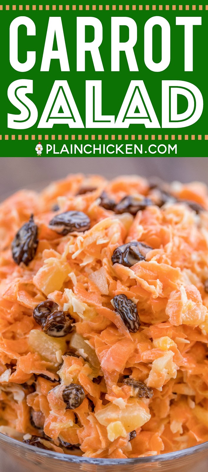 Carrot Salad - an easy and delicious side dish!! Only 6 ingredients - carrots, raisins, pineapple, coconut, sugar and mayonnaise. Reminds me of the carrot salad from Chick-fil-a!! SO good! Great side dish for potlucks or brunch. Can make in advance and refrigerate until ready to serve. YUM! #sidedish #carrotsalad #saladrecipeAnyone else miss the Carrot Salad from Chick-fil-a? It was always a favorite side dish. I hated when they pulled it from the menu!! I came across a recipe for Carrot Salad in one of my cookbooks, and decided to give it a try. OMG! SO good!! Chicken Legs isn't a carrot fan and was totally dreading tasting this Carrot Salad. One bite and he was a Carrot Salad fan! He LOVED it! I knew he would. Carrots, raisins, pineapple, and coconut. I mean, what's not to love?!?!